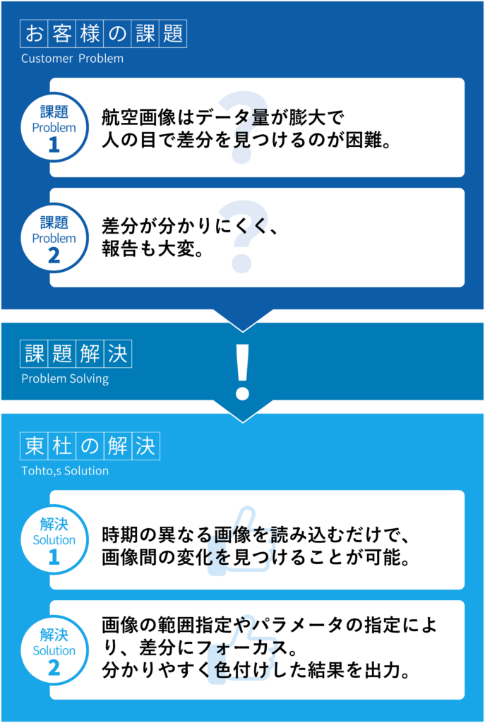 「空中写真変化検出システム」は、ドローンなどで撮影した時期の異なる空中写真を比較し、植物の成長度合いや河川ブロックの破損などの変化を検出するシステムです。発見した変化を出力することも可能です。